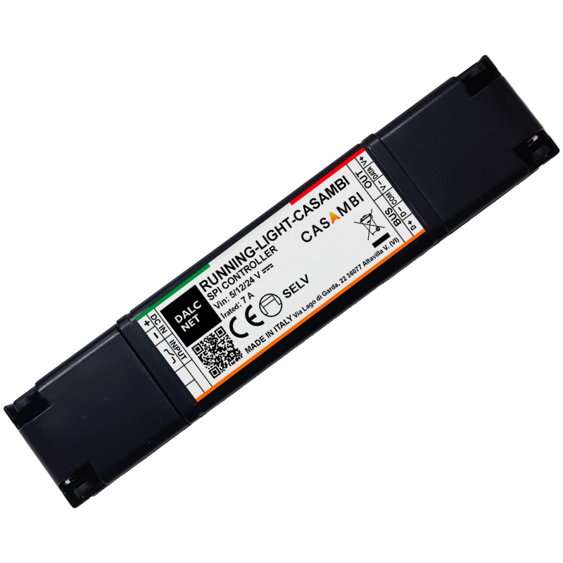 Running Light Casambi is an SPI controller designed for pixel-level control of digital LED strips within the Casambi ecosystem. It supports RGB, RGBW, and tunable white digital LED strips powered by a constant voltage supply ranging from 5 to 24 VDC.