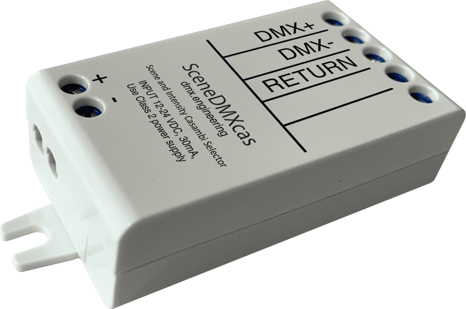 SceneDMXcas is a Casambi gateway that enables control of Casambi scenes directly from a standard DMX controller. Installed between a DMX universe and a 12–24 VDC Class 2 power supply, it allows predefined Casambi scenes to be triggered remotely.